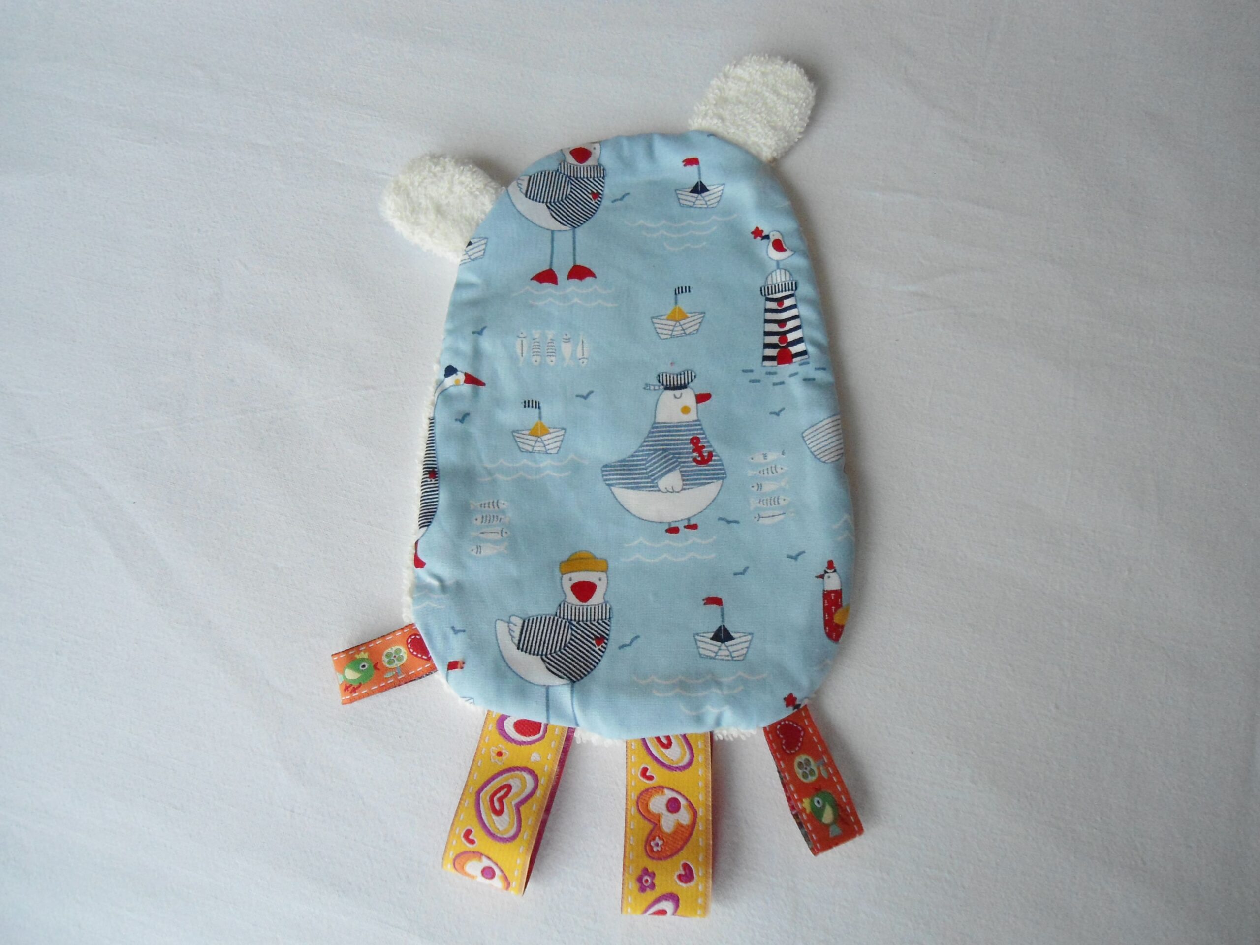 doudou plat visage brodé rose, différentes matières blanc/ bleu image mouette marine, dimension environ hauteur 24cm largeur 14cm
