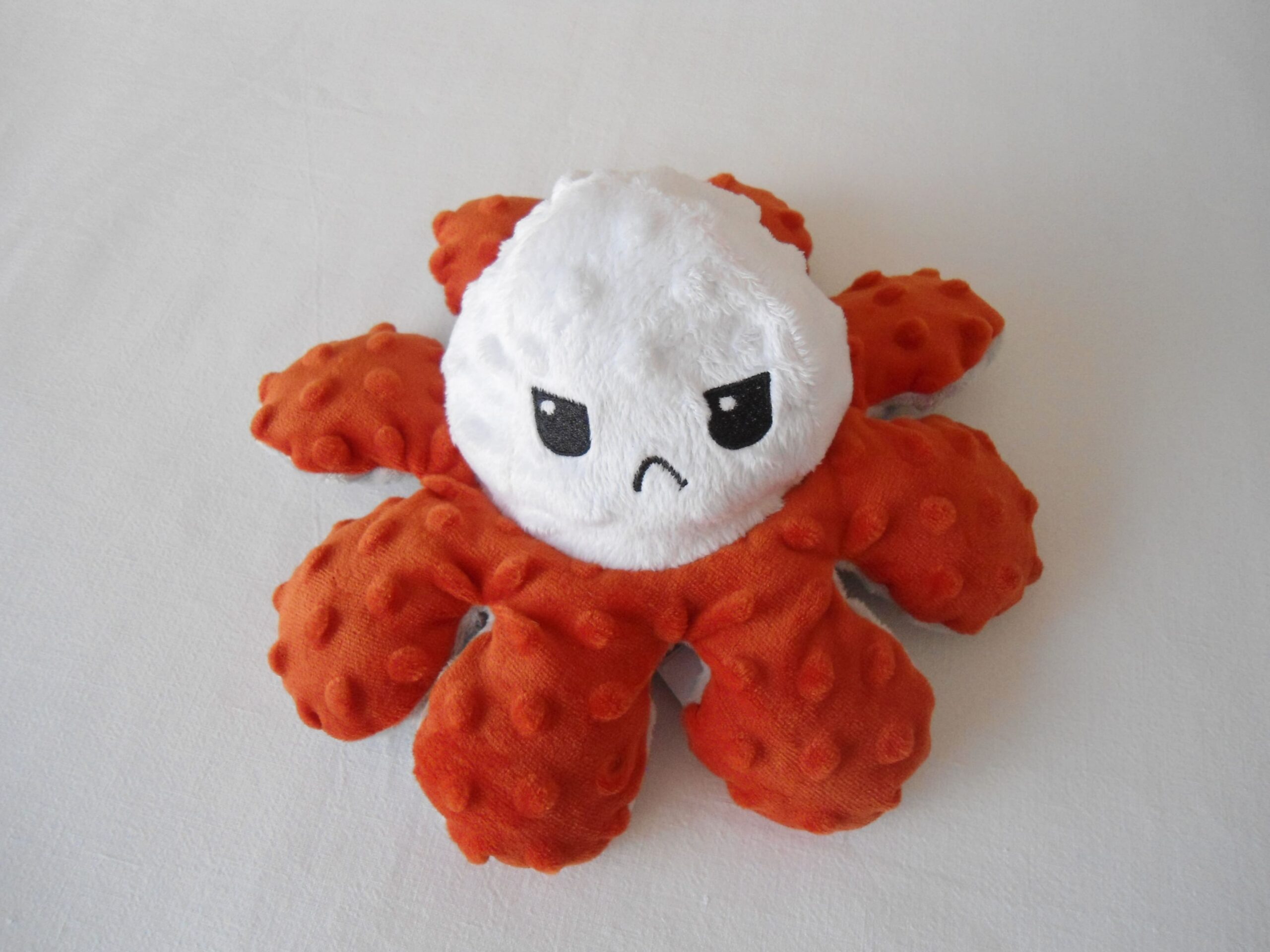pieuvre émotion réversible multi matières 🙂 orange, gris / 🙁 orange, blanc environ 28 cm de diamètre, 14 cm de hauteur